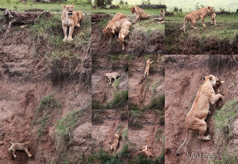 Sonunda aslanın çığlıklarını annesi duyuyor. Diğerlerinin inmeye cesaret edemediği yamaçtan, kendi hayatını hiçe sayarak aşağıya kayarak iniyor, yavrusunu yakalıyor ve ağzında taşıyarak tekrar yukarı çıkarıyor.