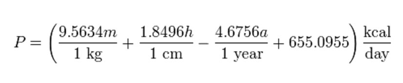 Bu formüle dayanarak 55 yaşındaki 59 kg ve 168 cm boyundaki bir kadın için BMR 1272 kcal/gün veya 61.3 watt kcal/sa olarak hesaplanabilir (Haris and Benedict 1919).