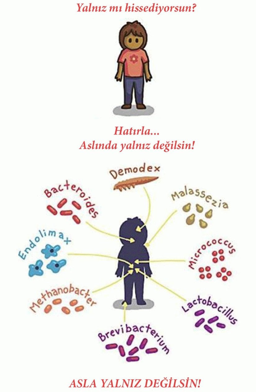 Ancak vücudunuzda yaşayan tek hücreler bunlar değildir. Özellikle de deride, süt bezlerinde, sperm sıvısında (meni), rahimde, yumurtalıklarda, akciğerlerde, ağız mukozasında, göz kapaklarının iç yüzeyi ile skleranın bir kısmını örten ince zarda (konjunktiva), safra yolunda ve sindirim kanalında bol miktarda bakteri, arke, mantar, protista yaşamaktadır (ve hatta bunlara, vücudumuzda bulunan ama "cansız" olarak kategorize edilen fajlar, virüsler ve plazmidler de dahil edilebilir). Bunların sayısı, insan hücrelerinin sayısından kat kat daha fazladır!