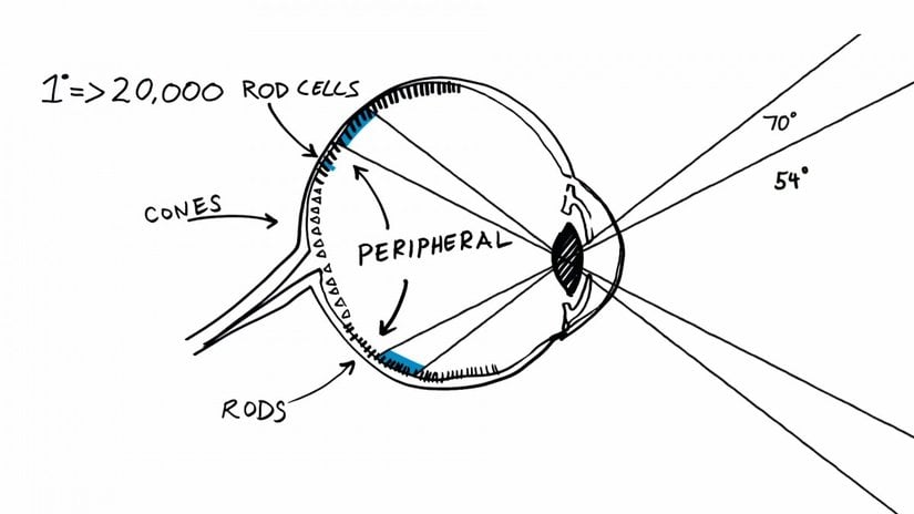 - İnsanın her bir gözü doğrudan karşıya baktığında yaklaşık 95 derece yatay görüş alanına sahiptir ve iki gözün çakışan görüş alanı 114 derece olup derinlik algısını sağlar.