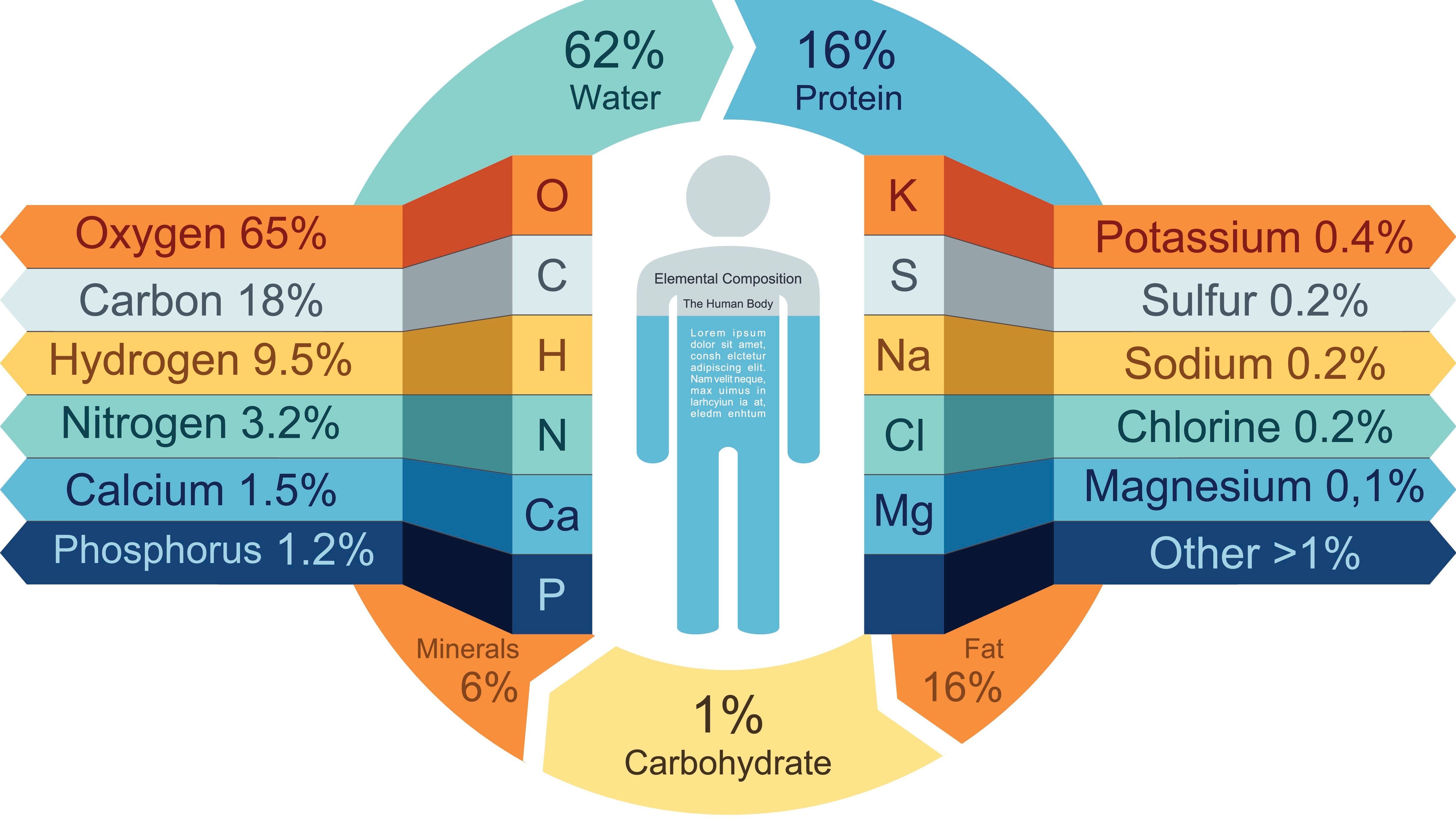 Aşağıdaki görselde gördüğünüz, vücudumuzu oluşturan tüm elementlerin kütlece oranlarıdır (bu yüzdeler, atom sayılarının oranı değildir!). Elbette bunlar kişiden kişiye, yaştan yaşa, hatta gün içerisinde zamandan zamana değişebilir (örneğin ne yediğinize bağlı olarak). Ancak ortalama olarak hazırlanmıştır ve birçok kişi için kabaca doğru olacaktır. Daha önemlisi, elementlerin birbirlerine nazaran oranlarını görmek açısından faydalıdır.