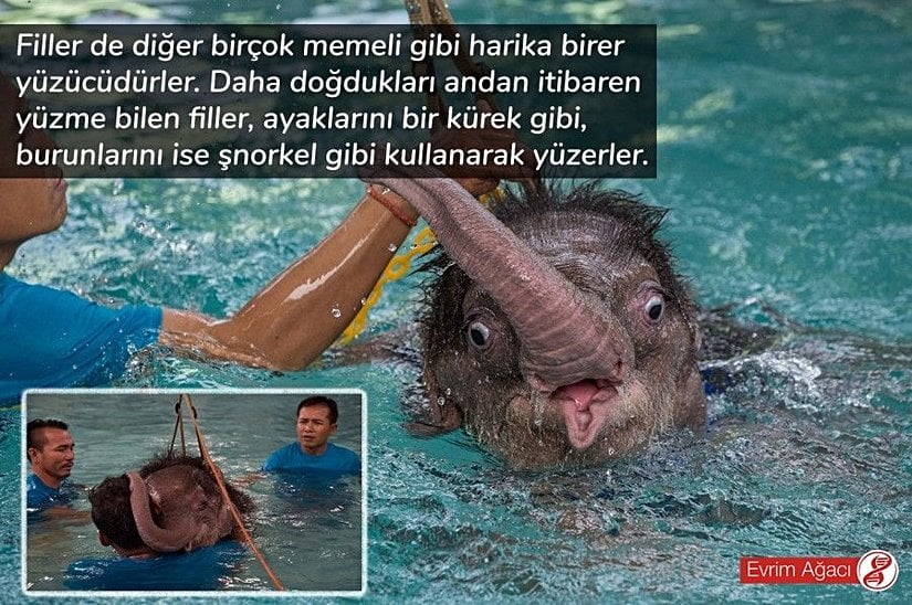Bunun haricinde filler gibi devasa memelilerin bile harika birer yüzücü olmaları şaşırtıcı gelebilir. Her ne kadar fotoğrafta komik bir kare görsek de, aslında filler genellikle sudan korkmazlar, tam tersine, suda oynamaya bayılırlar. Ancak bu, genelde annelerin çocuklarını teşvik etmesi sonrasında yaşanır.