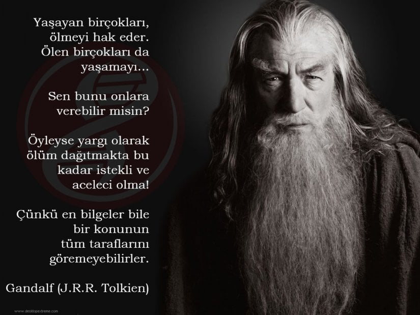 Yaşayan birçokları, ölmeyi hak eder. Ölen birçokları da yaşamayı... Sen bunu onlara verebilir misin? Öyleyse yargı olarak ölüm dağıtmakta bu kadar istekli ve aceleci olma! Çünkü en bilgeler bile bir konunun tüm taraflarını göremeyebilirler.