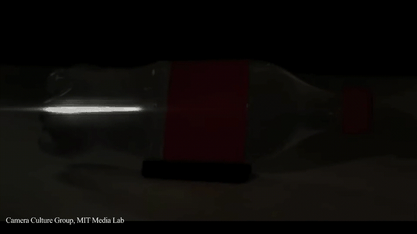 MIT Media LabUfak bir ışık huzmesinin şişe boyunca hareketi... Bu, MIT Medya Laboratuvarı araştırmacıları tarafından gözlenmiştir.[4]