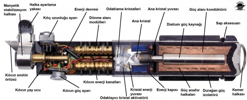 Standart kılıcın sapı 24-30 cm uzunluğunda, 1 kg ağırlığında metal silindirdir. Tabi bu uzunluk silah sahibinin kişisel ihtiyaçlarına göre değişebilir. Silah enerjisini Diatium güç kaynağı‘ından alır. Buradan çıkan yüksek yoğunluklu enerji, birkaç odaklama lensi ve üreteçten geçerek kuvvetli plazmaya dönüşür. Silahın sapına yerleştirilen durağan güç izolatörü, herhangi bir enerji deşarjına karşı kılıç sahibini korur. Ancak sadece bu yetmez, yüksek ısınmaya karşı kılıcın bir nevi soğutucu jeneratörleri bulunması gerekir. Aksi halde kılıcın sapına dokunmak imkansız olurdu.