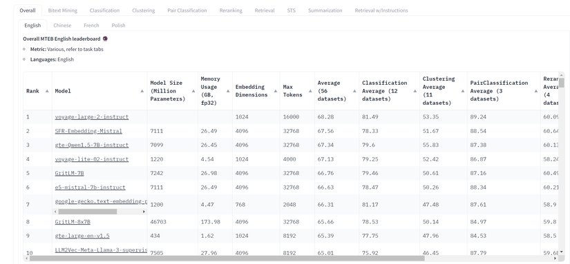 MTEB liderlik tablosu (İng: "Multitask Text Embedding Benchmark"), çok çeşitli görevlerde çeşitli gömme modellerinin performansına ilişkin kapsamlı bir genel bakış sağlayarak geliştiricilerin kendi benzersiz uygulama ihtiyaçlarına göre farklı gömme modellerinin güçlü ve zayıf yönlerine dayalı bilinçli kararlar vermelerine olanak tanıyor.