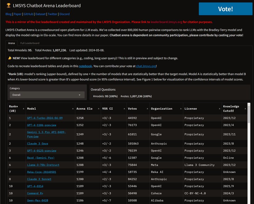 Open LLM Leaderboard'u alanındaki en iyi ve en yeni modelleri için keşif motoru olarak görürsek, Chatbot Arena da insan değerlendiriciler tarafından derecelendirilen en iyi modelleri keşfetmek için başvuracağınız yer olmalıdır.