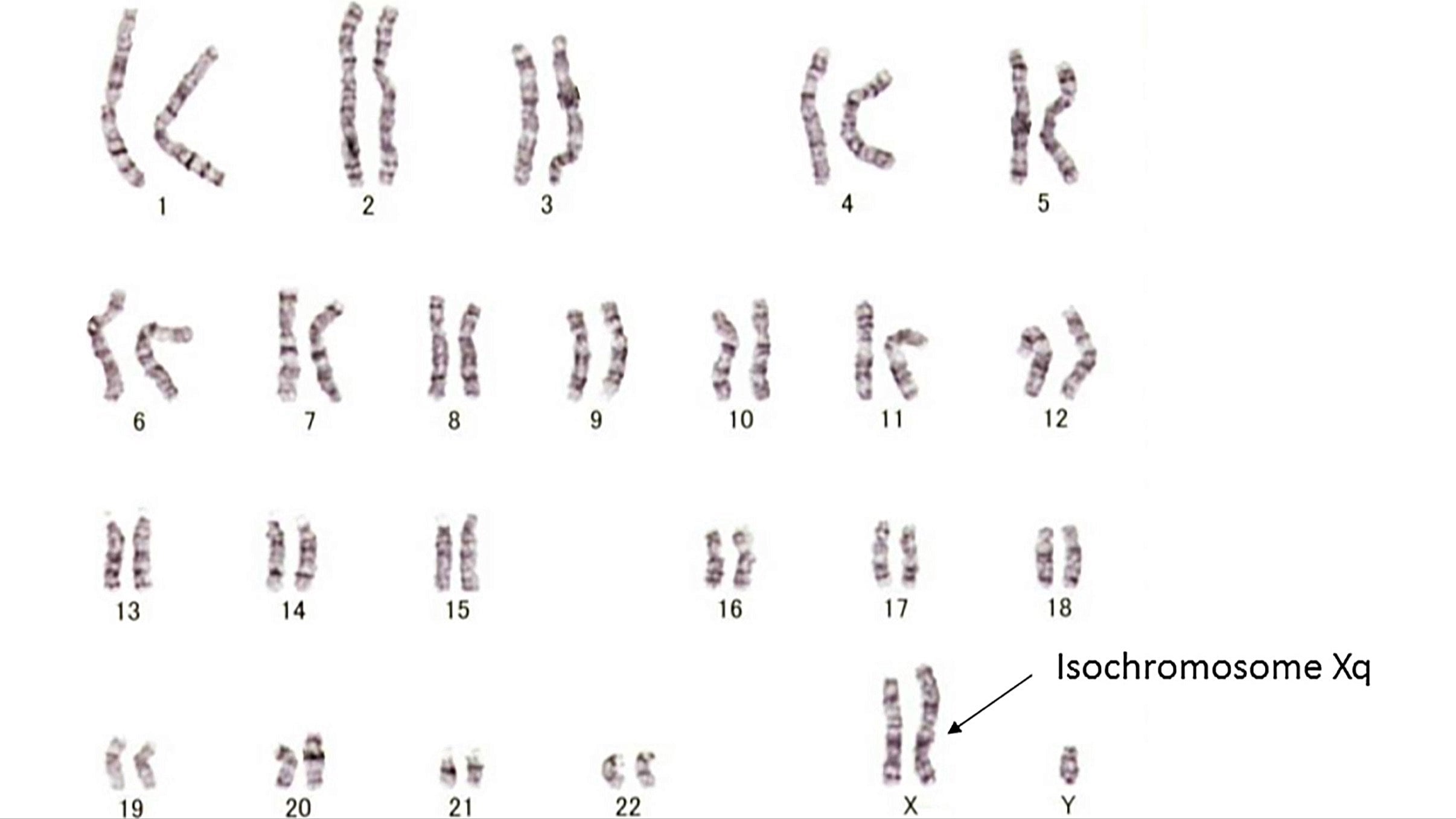 Turner Sendromu, kadınlarda bir X kromozomunun kısmen veya tamamen eksik olduğu, büyüme ve gelişim sorunlarına neden olan genetik bir durumdur. Turner sendromu hastalarının %15'inde bulunan yapısal anormallik, q kolunun iki kopyasından oluşan X izokromozomudur (i(Xq)). i(Xq)'nin çoğu, U-tipi iplik değişimi ile oluşur. P kolunun perisentrik bölgesindeki bir kırılma ve yeniden birleşme, disentrik bir izokromozom ile sonuçlanır.