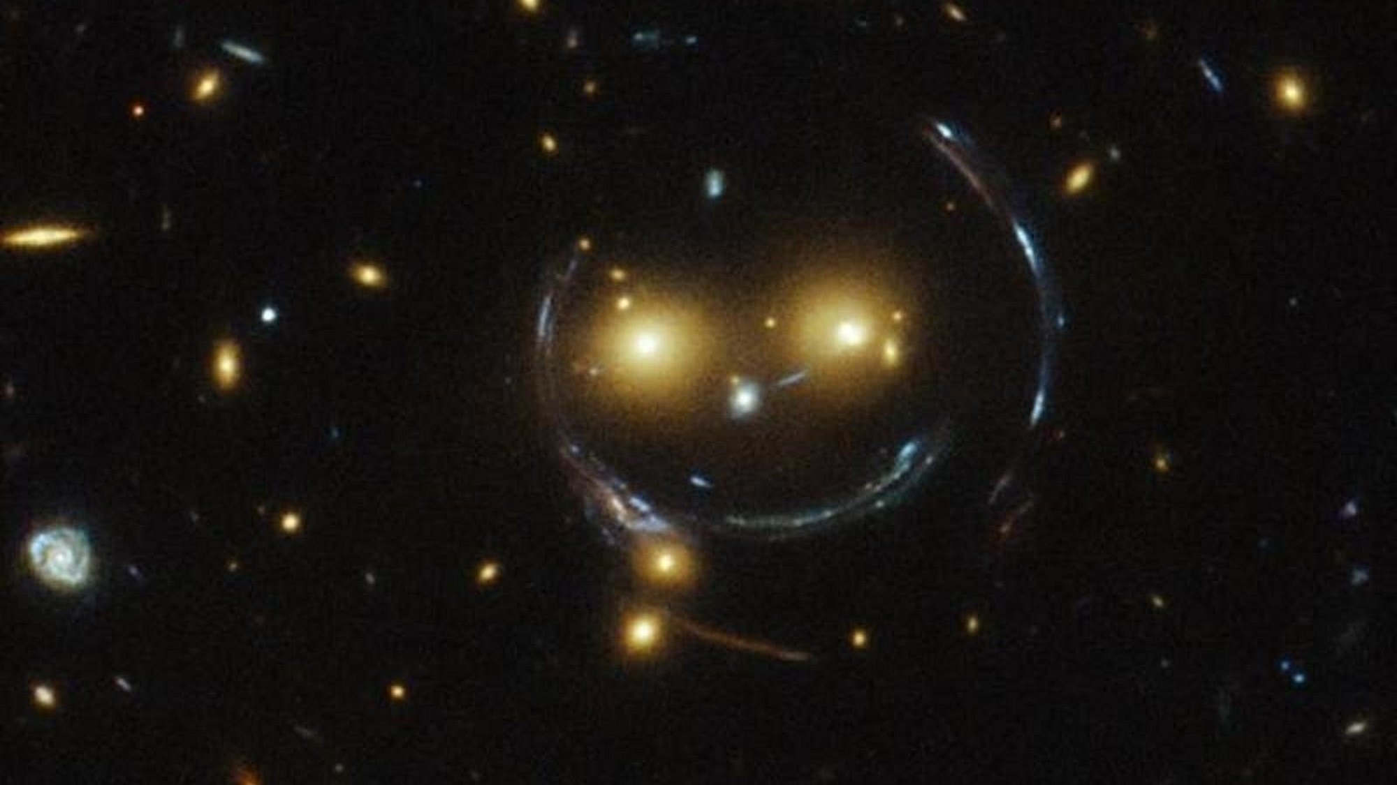 Burada gördüğümüz de, bunun bir örneğidir. Hubble Teleskobu tarafından çekilen bu fotoğraftaki gök cisimleri, adeta bir "gülen surat" yaratmaktadır. Kozmik bir gülen surat! J1038 kümesine ait bu gök cisimleri, Dünya'dan 4.5 milyar ışık yılı uzaktadır. Bir diğer deyişle, bu gök cisimlerinden bizim Dünya'mıza bakan zeki yaşam formları varsa, şu anda gezegenimizin daha yeni doğduğu, üzerinde hiçbir yaşamın bulunmadığı ve halen ağır bir meteor bombardımanı olduğu, Güneş Sistemi'mizin erken dönemlerini görebiliyor. Çünkü örneğin İstanbul'dan şu anda çıkan bir ışık, yani medeniyetimize ait görsel bilgi, oraya ancak 4.5 milyar yıl sonra ulaşabilecek!