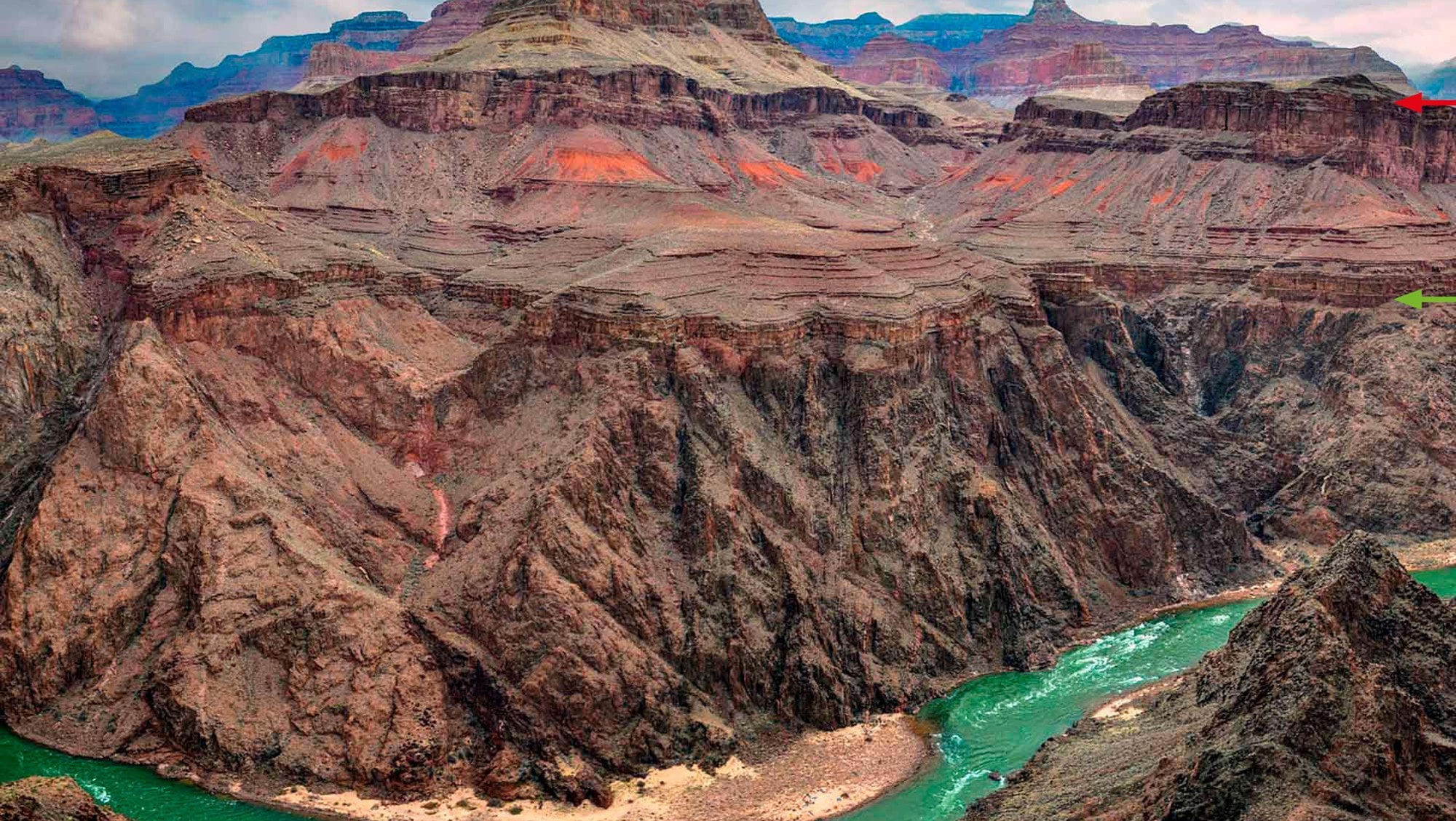 Yukarıdaki fotoğraflardan da görülebileceği gibi kırmızı çizgilerin altındaki katmanlar 1.7 milyar yaşında iken çizginin üstü sadece 550 milyon yıl yaşındadır. Bu fark, bize 1 milyardan uzun bir uyumsuzluk vermektedir.[5]