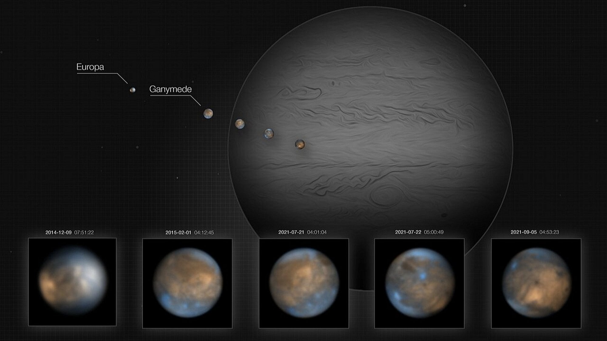 Europa ve Ganymede'nin bu yeni fotoğrafları, uyduların jeolojik yapılarını gözler önüne sermektedir. Özellikle Europa uydusunun yüzeyi boyunca uzanan yarık benzeri şekiller görülebilmektedir.