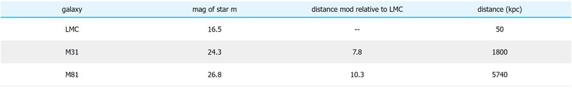 LibreTextsDiyelim ki bu tabloyu üretmenizde on yıl sonra, gökbilimciler LMC'ye yapılan ölçümlerde sistematik bir hata keşfettiler. Bizden 50 kiloparsek uzakta değil de aslında 60 kiloparsek uzakta olduğunu fark ettiler. Bu durumda: