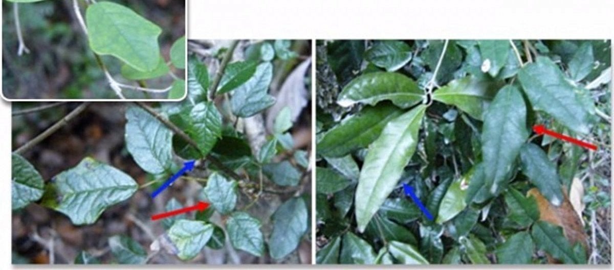 Sarmaşık, bir ağacın dallarına tırmandığında, çok yönlü ek yaprakları şekillerini, renklerini, yönelimlerini ve hatta desenlerini değiştirerek etraflarındaki ortama kamufle olabiliyorlar. Fotoğrafta, sol alt köşedeki büyük karedeki kırmızı ok sarmaşığı gösteriyor, mavi ok ise konak bitkiyi gösteriyor). Eğer ki sarmaşık ikinci bir bitkiye geçerse, yeni bitkinin yaprakları 10 kat büyük ve tamamen zıt bir şekilde olsa bile sarmaşık şekil ve boyut değiştirebiliyor (fotoğrafın sağ tarafında bu gösteriliyor).