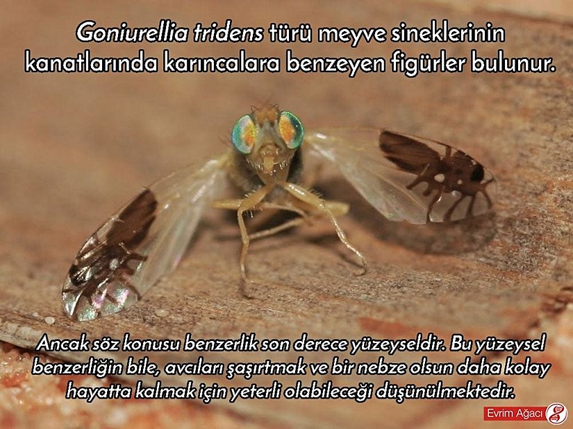 Goniurellia tridens türü meyve sineklerinin kanatlarında karıncalara benzeyen figürler bulunur. Karıncalar ile meyve sinekleri, genellikle ortak avcıları paylaşmaktadırlar. Bu avcıları sineğe yaklaştığı zaman, bu kanatları hızlı bir şekilde çırparak etrafında birçok karınca varmış gibi bir izlenim yaratmaktadır. Bu, avcıların kafasını karıştırır ve birkaç saniyeliğine de olsa meyve sineğine kaçma imkanı verir.