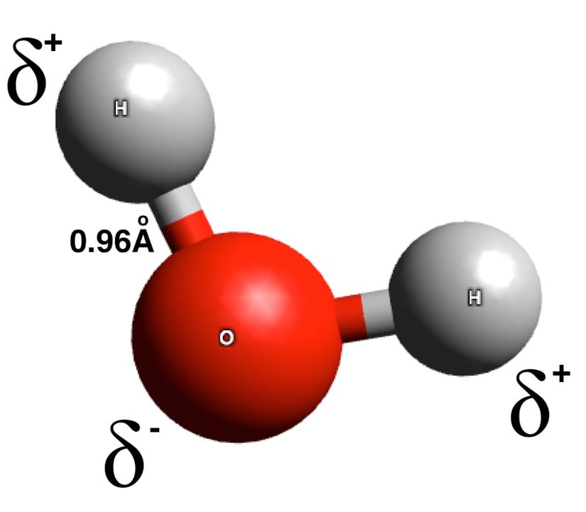 Böylece hidrojen ve oksijenin kovalent bir bağ oluşturduğunu, yani elektronlarını paylaştıklarını öğrenmiş olduk. Ama ayrıca oksijenin o elektronuna daha sıkı tutunmak istediğini, yani paylaşımın tam eşit olmadığını da söylemeliyiz. Oksijen, elektronuna daha kuvvetli tutunur ve negatif yükü hidrojenlerden uzaklaştırıp kendisine doğru çeker. Bunun sonucunda hafifçe negatif bir oksijen ve hafifçe pozitif hidrojenler oluşur.