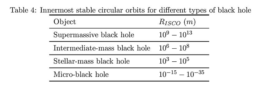RISCO=3RS=6GMBHc2=4.4×10−27m(MBHkg)\Large R_{ISCO}=3R_S=\frac{6GM_{BH}}{c^2}=4.4\times 10^{-27} m(\frac{M_{BH}}{kg})