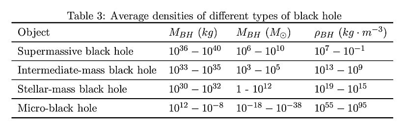 Tablo 3'te farklı kara delik türleri için ρBHρ_{BH} değerleri; kg cinsinden kütle aralıkları ve her biri için M⊙M_⊙ güneş kütlesi birimleri de dahil olmak üzere gösterilmektedir. Yıldız kütleli kara delik ve süper kütleli kara deliğe ek olarak, sağlam gözlemsel kanıtların bulunduğu tek tür olan iki varsayımsal nesne de gösterilmiştir: orta kütleli kara delik ve mikro-kara delik.