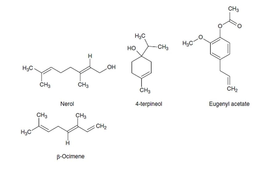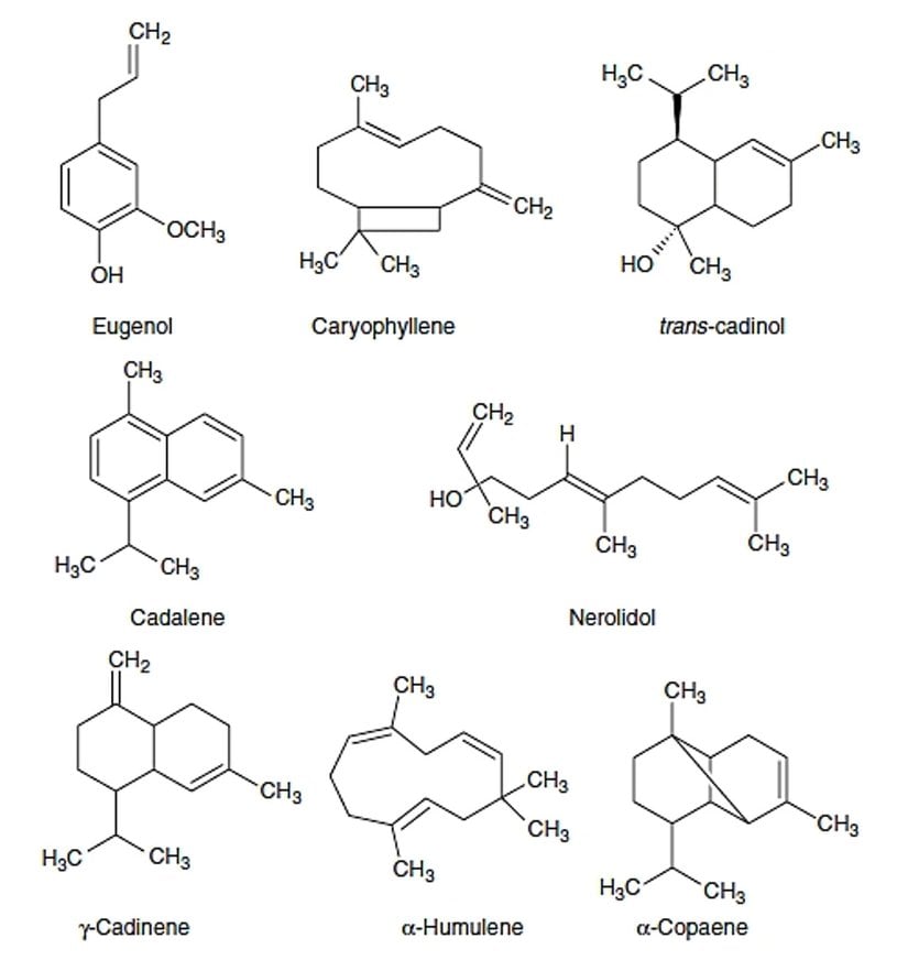 Kaliteli karanfil tomurcukları %15-20 oranında esansiyel yağ içerir. Yağa, birlikte yağın %99'unu oluşturan öjenol (%70-85), öjenil asetat (%15) ve b-karyofillen (%5-12) hakimdir. Daha önce damıtmanın bir artefaktı olduğu düşünülen b-Caryophyllene, ilk olarak Walter (1972) tarafından tomurcuk yağının bir bileşeni olarak rapor edilmiştir. Yağın bileşenleri arasında ayrıca metilamilketon, metilsalisilat, a- ve b-humulen, benzaldehit, b-ylangen ve chavicol bulunur. Metilamilketon, metilsalisilat vb. gibi küçük bileşenler, karanfilin karakteristik hoş kokusundan sorumludur. Karakterize edilmiş altı seskiterpen şöyledir: