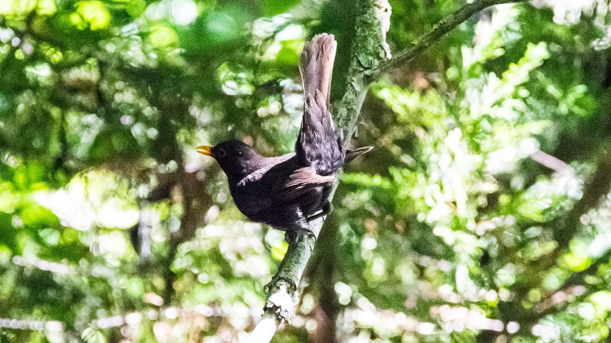 Karabük/Safranbolu'da yüksek ağaçların bulunduğu bir parkta karşımıza çıkan yetişkin bir erkek karatavuk (Turdus merula).