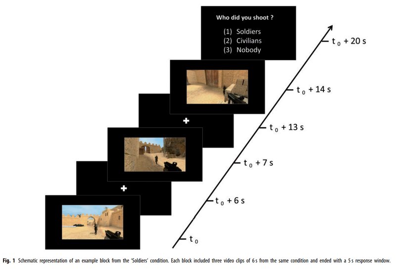 Social Cognitive and Affective NeuroscienceVideolardan bir tanesinde bir asker, bir düşman askerini öldürüyordu. Bir sonraki videodaysa asker, bir sivili öldürüyordu. Kontrol grubu olarak kullanılan sonuncu videodaysa asker ateş ediyordu; ama hiçbir şeyi vurmuyordu. Tüm durumlarda denekler olayı askerin gözünden izliyorlardı. Bunu, first person shooter denen bir oyun gibi düşünün... Yani ateş eden kişilerin kendileri olduğunu hayal etmeleri çok da zor değildi.