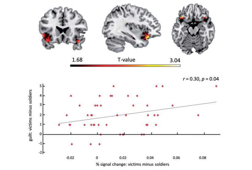 Social Cognitive and Affective NeuroscienceMolenberghs'in araştırmasında, kişiler askerler yerine sivilleri her vurduklarında, OFC'nin yanal bölgesinde sürekli olarak daha fazla aktivite gözlendi. Aynı zamanda siviller vurulduğunda OFC ile TPJ arasında daha fazla veri aktarımı oluyordu. Bir diğer deyişle OFC, aktif olarak "Ben suçlu hissediyorum." diyordu, TPJ ise cevaben "Evet, öyle hissetmelisin." diye ahlaki sonucu destekliyordu. Daha da önemlisi, OFC aktivitesinin aynı zamanda deneklerin 1'den 7'ye kadar olan suçluluk skalasında nerede olduklarını belirlemede de etkili olduğu gösterildi. Eğer OFC'de daha fazla aktivite varsa, birey de daha yüksek suçluluk değerlerini seçiyordu. Bu da, OFC ile bireysel suçluluk arasındaki ilişkiyi doğruluyor.