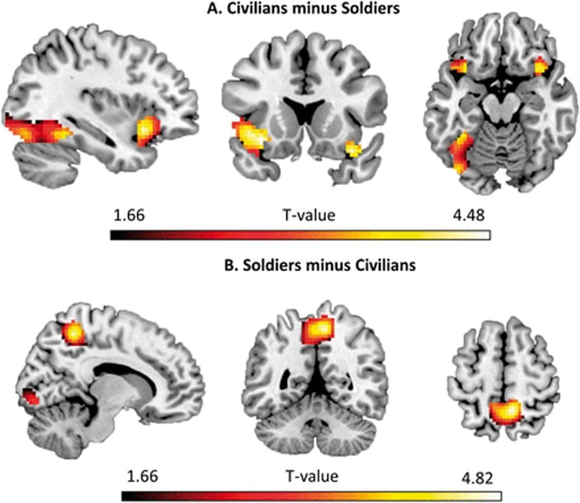 Öte yandan denekler askerleri öldürürken beynin arka tarafında bulunan lingual gyrus denen bir bölgesinde de faaliyet görüldü. Bu bölge, daha az duygusal olan, uzaysal mantıklamanın yapıldığı bölge. Kendinizce ölmesini haklı bulduğunuz birini öldürmeye giderken, soğukkanlılıkla kullandığınız bölge de burası. Yani ilginç bir şekilde, bir diğer askeri öldürürken, ahlaki yargıları işleyen bölgelerden ziyade, içinde bulunduğumuz uzay-zamana yönelik mantıklama bölgemiz daha aktif oluyor.