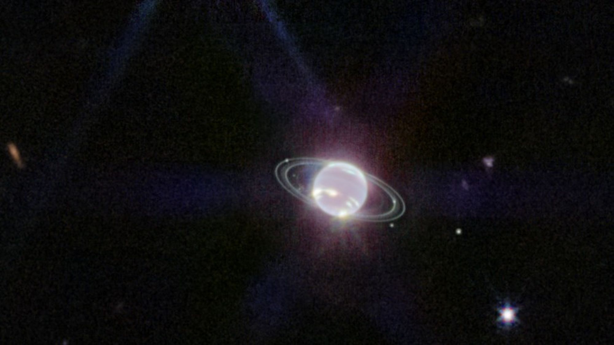 Webb ayrıca, Neptün'ün bilinen 14 uydusundan 7'sini de görüntüledi. Webb'in görüntülerinin çoğunda karşımıza çıkan imza kırınım dikenlerini gösteren çok parlak bir ışık noktası, Neptün'ün Webb portresine hâkim oluyor. Ancak bu bir yıldız değil. Aksine bu, Neptün'ün büyük ve sıra dışı uydusu Triton.