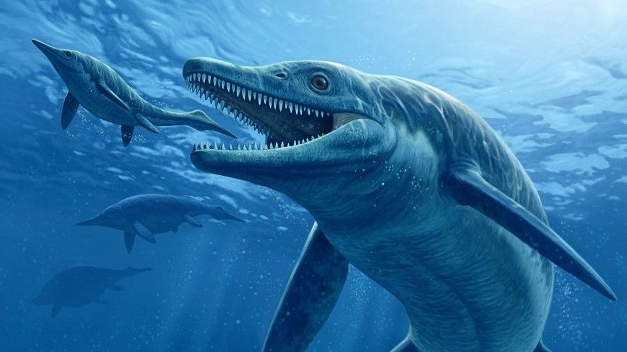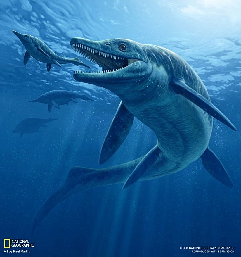 Görselde, sağ tarafta gördüğünüz tür olan Thalattoarchon saurophagis, yani "kertenkele yiyici deniz hakimi", Ichtyosaura olarak bilinen denizel sürüngenlerden ilkin bir örnektir. Yani karada yaşayan sürüngenlerin denizlerde yaşayacak şekilde evrimleşmesiyle ortaya çıkan türlerden birisidir. Günümüzde ne yazık ki hiçbir denizel sürüngen yaşamamaktadır; ancak bu eski canlılara ait çok sayıda ve iyi korunmuş fosile sahibiz.