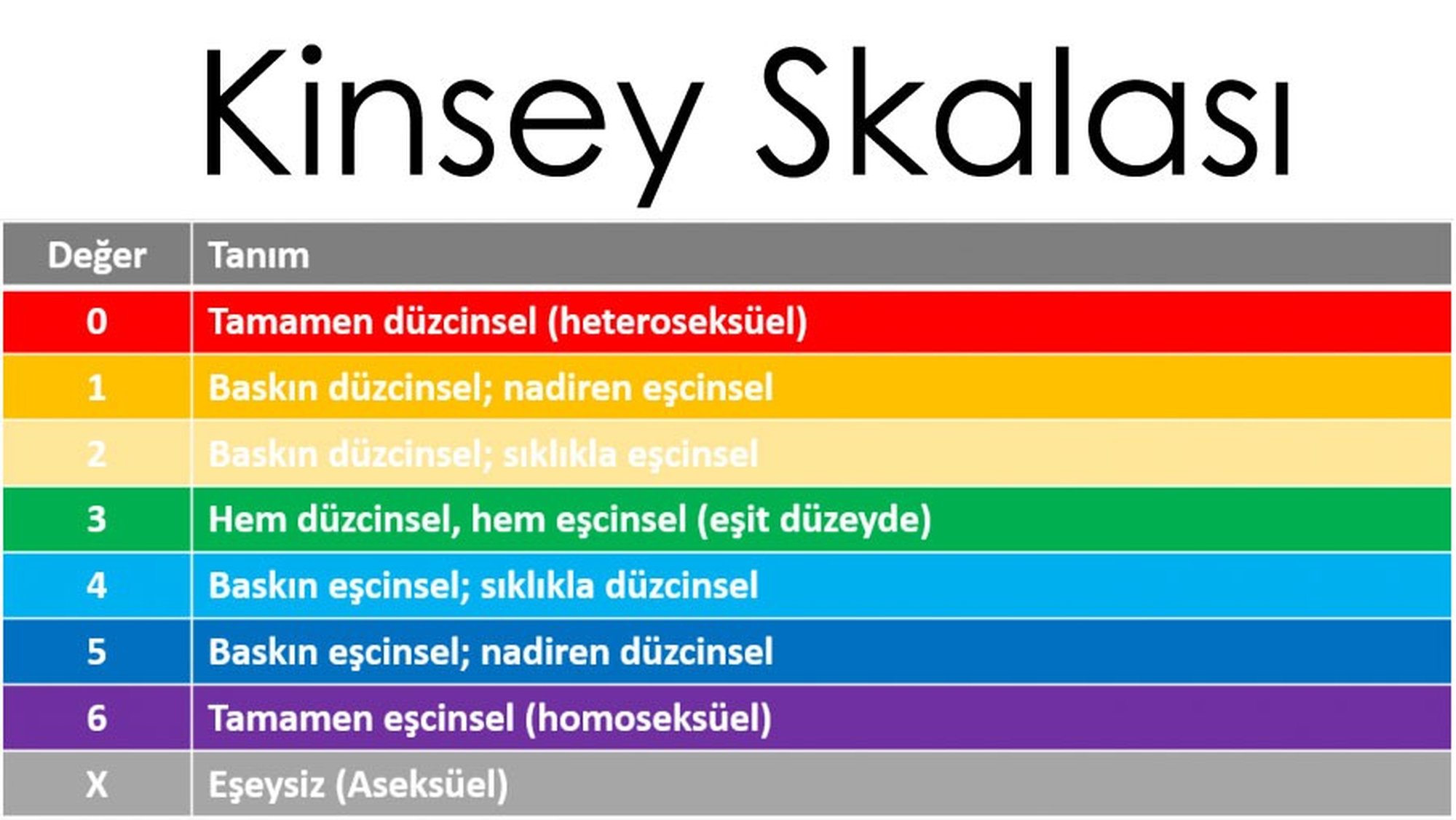 Ana görselde gördüğünüz, Kinsey'in bu kitaplarda ileri sürdüğü ve günümüzdeki çok sayıda psikolog tarafından yeterince kapsamlı olduğuna kanaat getirilen Kinsey Skalası'dır. Skalada, bir erkeğin veya bir dişinin yaşamı boyunca cinsel olarak çekildiği cinsiyetlere göre belli bir değer yer alır. Buradan da anlaşılacağı üzere, bir insan illa tam eşcinsel veya tam düzcinsel olmak zorunda da değildir.