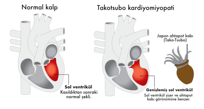 - Takotsubo kardiyomiyopatisi, aşırı stres sonucu sol ventrikülde geçici hasar oluşturan ve kalp krizini taklit eden ancak %95 oranında tam iyileşen benign bir hastalıktır.