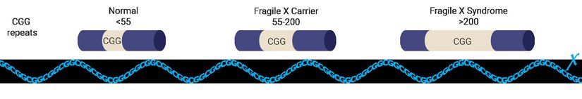 Etkilenmemiş bireyler, Xq27.3 bandının 5' ucundaki ilk ekzonda 5-54 CGG tekrarına sahiptir. 45-54 tekrarı olan bireyler etkilenmez ancak gelecek nesillere bir ön mutasyon geçirme riski taşırlar. 55-199 tekrar aralığı önmutasyon olarak bilinirken 200 veya daha fazla tekrar, tam mutasyondur.