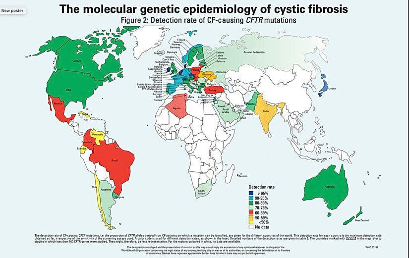 World Health OrganizationYukarıdaki haritadan görüldüğü üzere kistik fibrozis birçok ülke için sorun teşkil eder. Amerika Birleşik Devletleri'nde her 2500 doğumda 1 kistik fibrozisli bebek doğuyor. Belki bu oran ilk etapta kulağa büyük gelmeyebilir; fakat kistik fibrozisin özellikle beyaz popülasyonda en ölümcül genetik hastalık olduğu unutulmamalıdır.