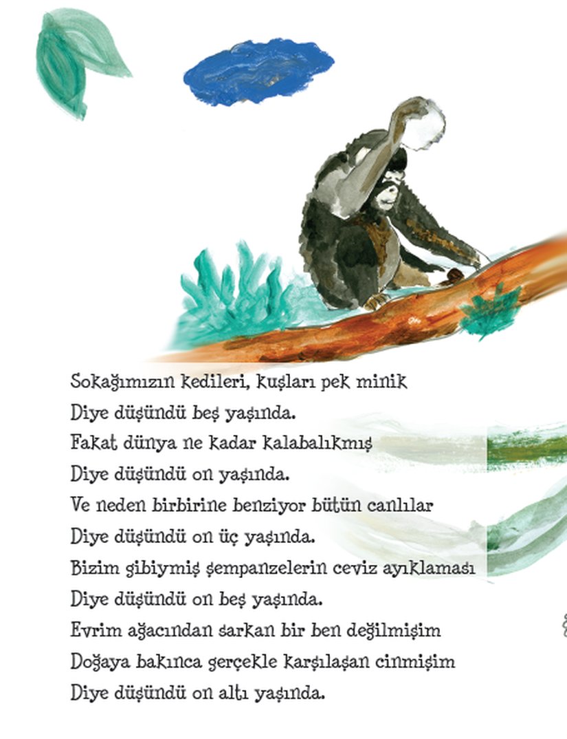 Çocuklara modern bilimi öğretmek konusunda pek çok önemli işe imza atmış Zelal Özgür Durmuş tarafından hazırlanan ve Seda Mit tarafından çizilen bu ilginç kitap, "Doğadayım" serisine ait. Amaç ise çocuklara doğayı eğlenceli, şiirli bir dille anlatmak... Çocukları doğayı gözlemeye teşvik etmek, onlara doğanın ilginçliğini fark ettirmek, doğayı tanıma isteği uyandırmak gibi hedeflerle bir seriye başlamışlar. Serinin ilk kitabında doğa kuşların gözünden anlatılıyordu, şimdi ise aynı serinin maymunlar kitabı çıktı. Fotoğraflarda birkaç örnek görebilirsiniz.