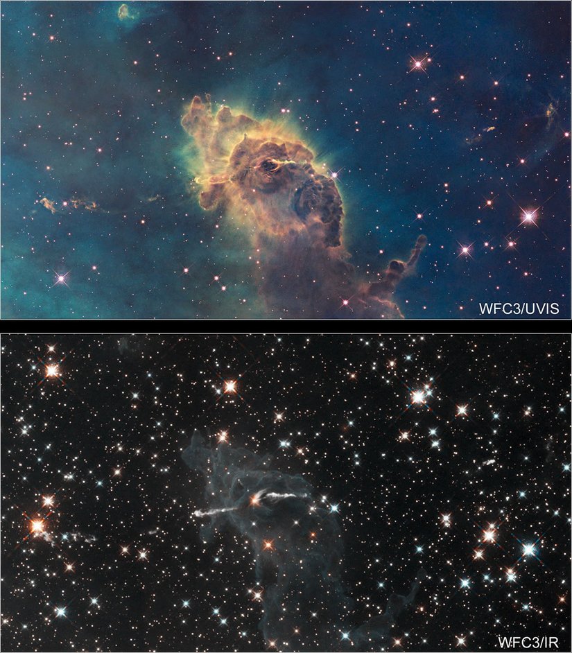 Kızılötesi ışınların enerjileri, görünür bölgedekilerden daha düşük olduğu için uzaydaki toz ve gaz bulutlarının arasından daha rahat bir biçimde geçebilirler. Aşağıdaki görselde Carina bulutsusunun görünür bölge ve kızılötesi bölge gözlemlerine bakarsak, yoğun gaz bulutlarının çoğu yıldızın (görünür) ışığını engellediğini ve bunun kızılötesi ile nasıl açık hale geldiğini görebiliriz.