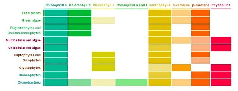 - Klorofil a; tüm kloroplastlarda bulunur ve tıpkı ataları olan siyanobakterilerde olduğu gibi mavimsi yeşil bir renk katar.