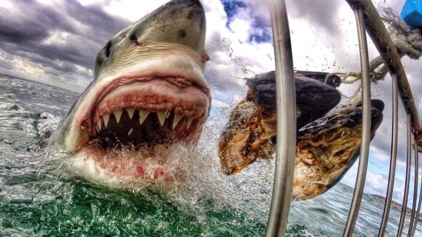 Yukarıdaki fotoğrafta ise, Güney Afrika'nın Mossel Körfezi'nde bulunan Seal Adası'nda kafesli dalış yapan 26 yaşındaki Amanda Brewer ismindeki okul öğretmeninin kamerasına yansıyan baş döndürücü bir görüntü görülmektedir. Dişi bir beyaz köpekbalığı, kendisine uzatılan et parçasına doğru hamle yapmaktadır. Brewer o anları şöyle anlatıyor:
