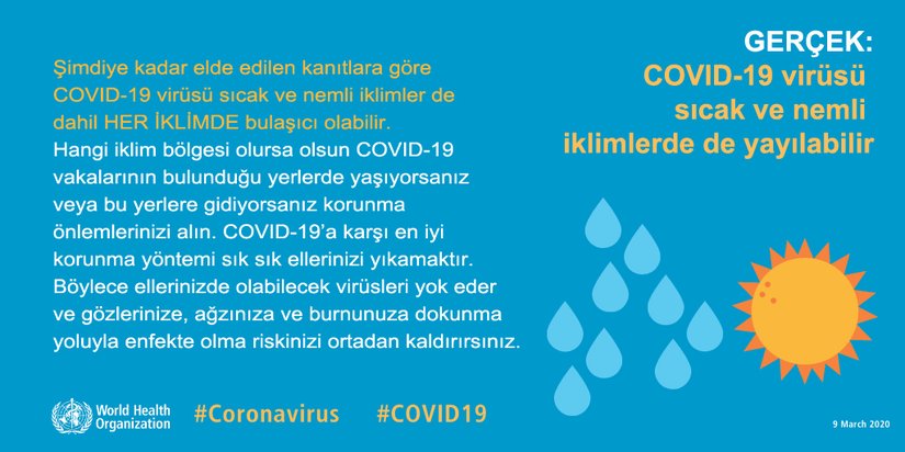- Dünya Sağlık Örgütü, koronavirüsün yayılma şekli, belirtileri ve korunma yöntemleri hakkında kapsamlı ve güncel bilimsel bilgiler sunmaktadır.
