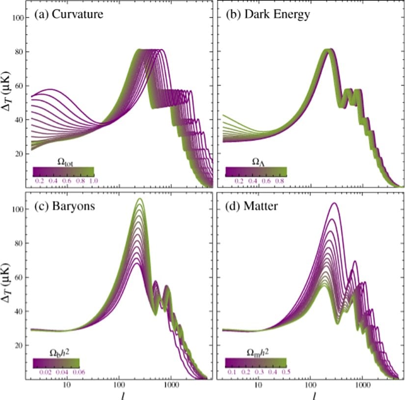 Professor, Department of Astronomy and Astrophysics University of ChicagoYukarıdaki çalışmada; (a) evrenin geometrisi, (b) karanlık enerji yoğunluğu, (c) baryonik madde yoğunluğu ve (d) madde yoğunluğu parametrelerinin değişimi durumunda, kuvvet tayfının biçiminin nasıl değiştiği gösterilmiştir. (a) grafiği, daha önce de bahsettiğimiz gibi l≈220l\approx220'de olan ilk pikin, toplam yoğunluk azaldıkça l>220l>220 bölgesine kaydığını göstermektedir. Toplam yoğunluğun azalması (1'in altına düşmesi) demek, evrenin açık bir geometriye sahip olacağı anlamına gelir. Dolayısıyla yeşil eğri düz bir evren için kuvvet tayfını, mor eğri ise açık bir evren için kuvvet tayfını gösterir. Düşük-ll değerleri bölgesinde, grafiğin sadece ötelenmekten ziyade, bir pik yapması gerektiği de görülmektedir. Fakat elde ettiğimiz kuvvet tayfı böyle bir bilgi taşımıyor. Bu sebeple, elimizdeki verilerin evren için düz bir geometriye işaret ettiğini söyleyebiliyoruz.