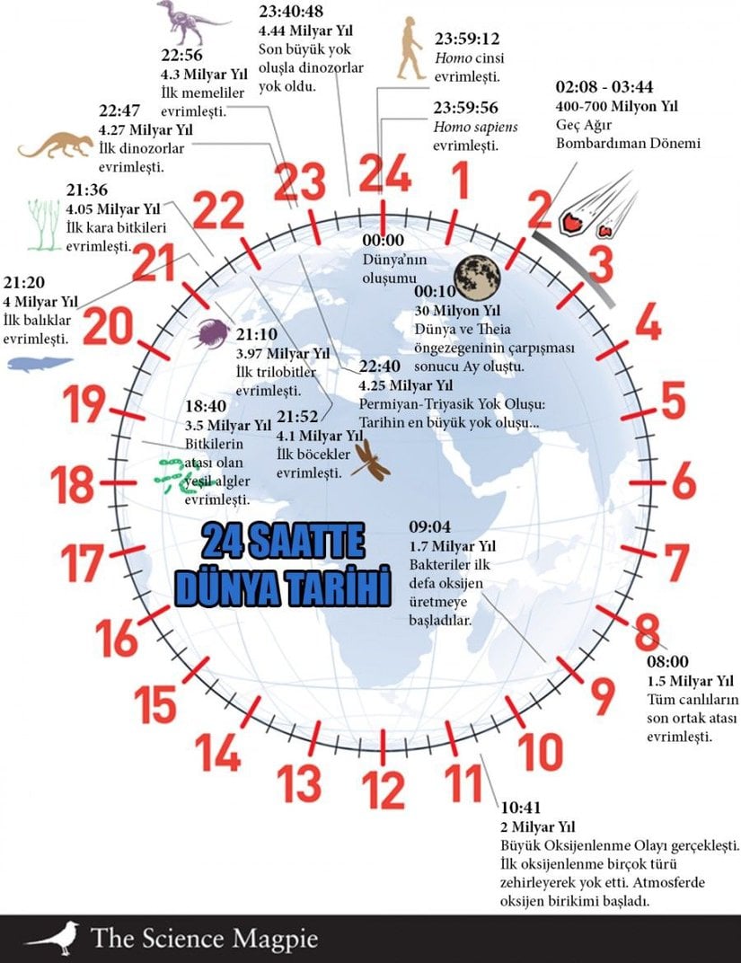 - 23:54'te, yani zamanın son 6 dakikasında bizler, yani "Homo sapiens" evrimleşmeye başlar.