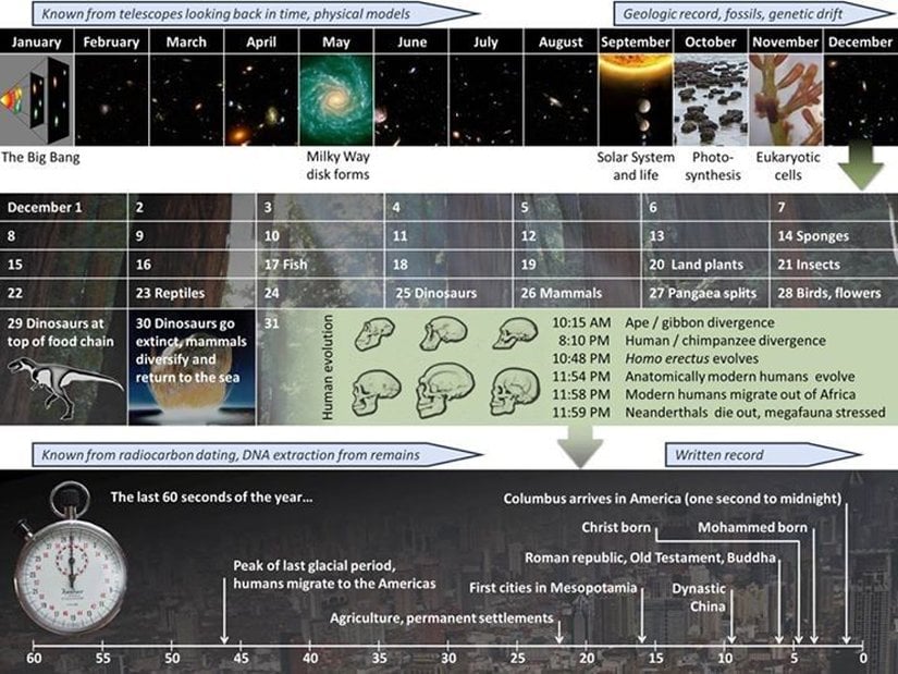 - Bu takvimde, insanın evrimi yılın son dakikalarına denk gelir; Homo sapiens 31 Aralık 23:54'te ortaya çıkar ve son 1 saniyede modern bilim ve uzay yolculukları gerçekleşir.