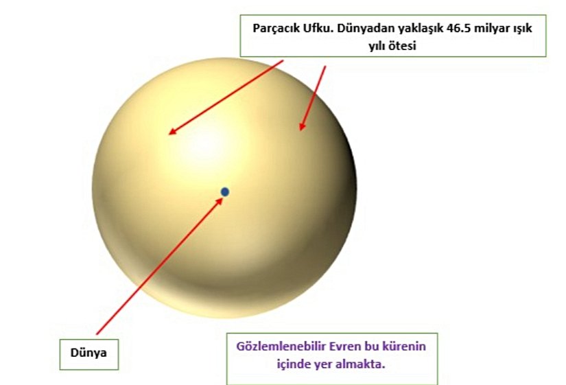 - Parçacık ufku, Evren'in yaşına ve genişlemesine bağlı olarak yaklaşık 46,5 milyar ışık yılı yarıçapında olup, gözlemlenebilir Evrenin sınırını belirler ve daha uzak nesnelerin ışığı bize ulaşamaz.