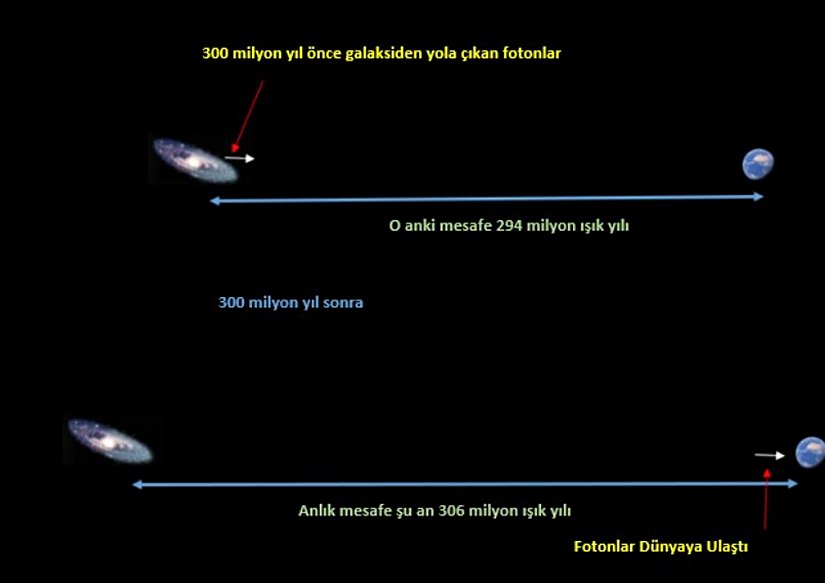 Aşağıdaki örnekte, 300 milyon yıl önce başka bir galaksiden Dünya'mıza doğru yola çıkan bir fotonun yola çıktığı anda Dünya ile arasındaki mesafe 294 milyon ışık yılıdır. Ancak Dünya, foton bize ulaşana kadar sürekli fotondan uzaklaşmaktadır. Yani bu foton Dünya'ya ulaşmak için aslında 300 milyon ışık yılı yol almıştır. Foton bize ulaştığında ise Dünya ve galaksi arasındaki o anki mesafe 306 milyon ışık yılı olacaktır.