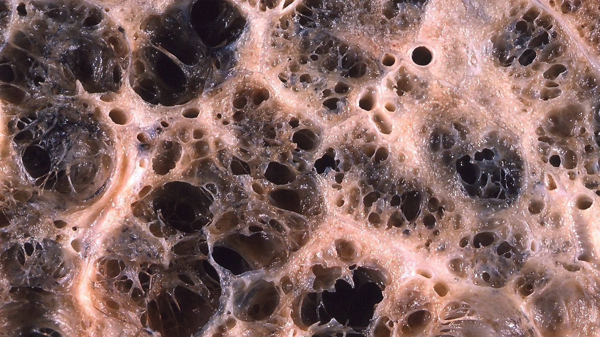 Resmin solunda şiddetli amfizem (büyük boş alanlar) görülmektedir. Görüntünün sağındaki akciğer dokusu alveollerin göreceli olarak korunmasına sahiptir. Görüntünün üst kısmı plevral (göğüs boşluğunu içten kaplayan ve akciğerleri çevreleyen, iki katlı, ince bir zar tabakası) yüzeye çok yakındır.