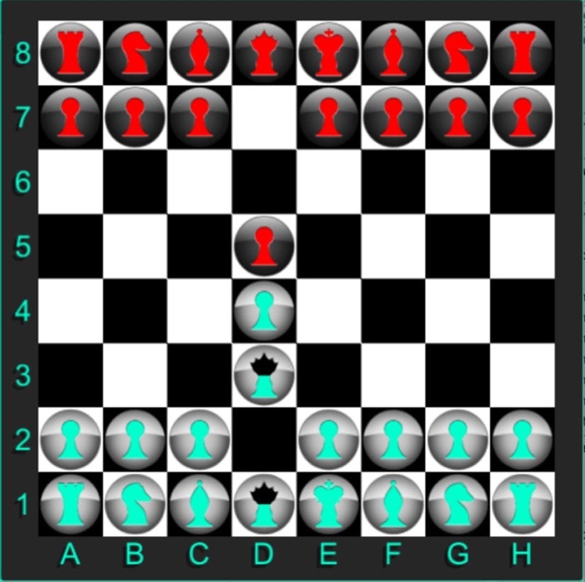 İki olası tahtamız var. Bunlardan birinde vezir hareket etmedi bile. Diğerinde vezir, hareket etti. Her iki tahtada da %50'lik bir "var olma" olasılığı var. Her bir olası tahtayı görecek olursak, sadece birkaç hamlede oyun fazlasıyla karmaşıklaşacaktır. Dolayısıyla oyuncunun önünde sadece 1 tahta var. Kuantum vezir hamlesinden sonra oyuncu, tahtayı şöyle görür: