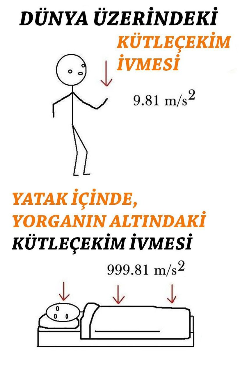 13. Kütleçekim ivmesi her cismi eşit miktarda hızlandırır. Bu hızlanma miktarı, kütlelerinden bağımsızdır. Eğer 8 katlı bir binanın tepesinden bir fili ve 1 kuruşu aynı anda bırakacak olsanız, teorik olarak ikisi yere aynı anda düşer. Ancak elbette bu muhtemelen gerçekleşmeyecektir; çünkü cisimlerin düşüşü sırasında sadece kütleçekimi işlevsel değildir. Hava sürtünmesi/direnci, adhezyon kuvvetleri gibi diğer kuvvetler sonucu etkilemektedir. Ancak kütleçekiminin iki cisim üzerindeki etkisi birebir aynıdır! Bunun sebebi, ağır cisimlerin daha yüksek atalete (ivmelenme direncine) sahip olmalarıdır. Ağırlıkları nedeniyle daha hızlı düşmeleri beklenir; ancak ivmelenmeye karşı dirençleri bunu dengeler ve bu sebeple aynı anda (aynı hızda değil!) düşerler.