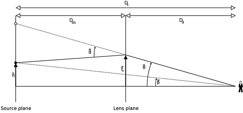β=θ−DdsDdDs4GM(θ)c2θ\Large\beta = \theta - \frac{D_{ds}}{D_d D_s} \frac{4GM(\theta)}{c^2\theta}