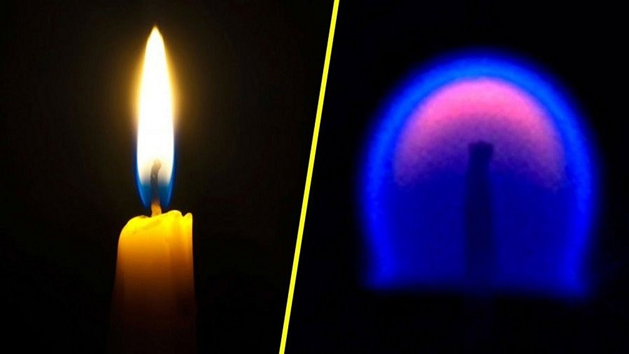 Fotoğrafta sol tarafta normalde görmeye alışık olduğumuz bir şekilde, bir mumun ucundaki alevi görüyorsunuz. Sağ taraftaki ise, kütleçekimsiz ortamda (ya da bir yörünge aracında) benzer bir şekilde yanan kibritin ucundaki aynı alevin nasıl göründüğüdür.