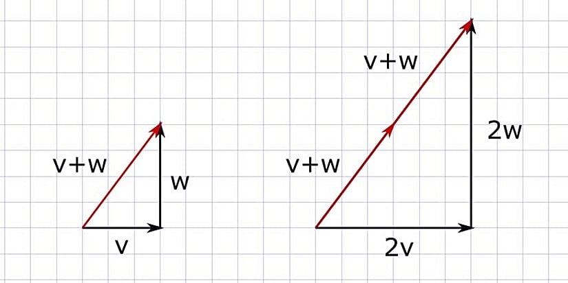Örneğin ikinci madde (a(∣V⟩+∣W⟩)=a∣V⟩+a∣W⟩a(|V\rangle + |W\rangle) = a|V\rangle + a|W\rangle) bize ne söylemektedir? Bunun bize söylediği, iki vektörü toplayıp bir skalerle (aa) çarpmanın onları ayrı ayrı bu skalerle çarpıp toplamakla aynı sonucu verdiğidir. Aşağıdaki figürde bunu daha net bir şekilde görebiliriz.