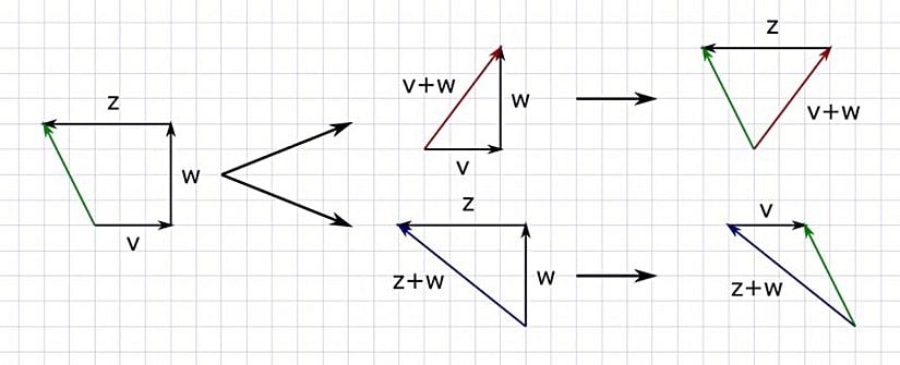 Bir diğer örnek olarak altıncı maddeyi (∣V⟩+(∣W⟩+∣Z⟩)=(∣V⟩+∣W⟩)+∣Z⟩|V\rangle + (|W\rangle + |Z\rangle) = (|V\rangle + |W\rangle) + |Z\rangle) inceleyelim. En kaba tabiriyle bu madde şunu söyler, üç vektörü toplarken önce hangi iki vektörü topladığınızdan bağımsız olarak, sonuçta aynı vektöre ulaşırsınız. Bunun beşinci maddeyle olan uyumuna dikkat edecek olursak, sadece ∣V⟩+(∣W⟩+∣Z⟩)=(∣V⟩+∣W⟩)+∣Z⟩|V\rangle + (|W\rangle + |Z\rangle) = (|V\rangle + |W\rangle) + |Z\rangle olduğunu değil aynı zamanda ∣V⟩+(∣Z⟩+∣W⟩)=(∣V⟩+∣Z⟩)+∣W⟩|V\rangle + (|Z\rangle + |W\rangle) = (|V\rangle + |Z\rangle) + |W\rangle olacağını da görürüz. Yani toplamanın sırası sonucu değiştirmez, işlem sırasında farklı vektörler oluşsa da sonuç aynıdır. Aşağıdaki figürde bu iki farklı senaryoyu görebiliyoruz, sonuçta oluşan yeşil renkli vektörlerin aynı olduğuna dikkat edin.