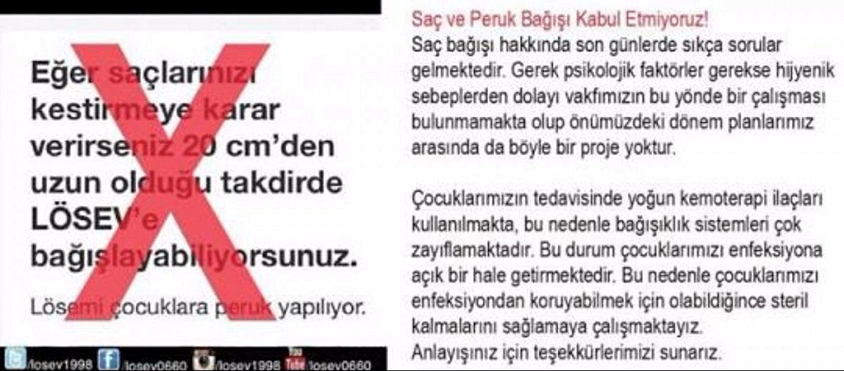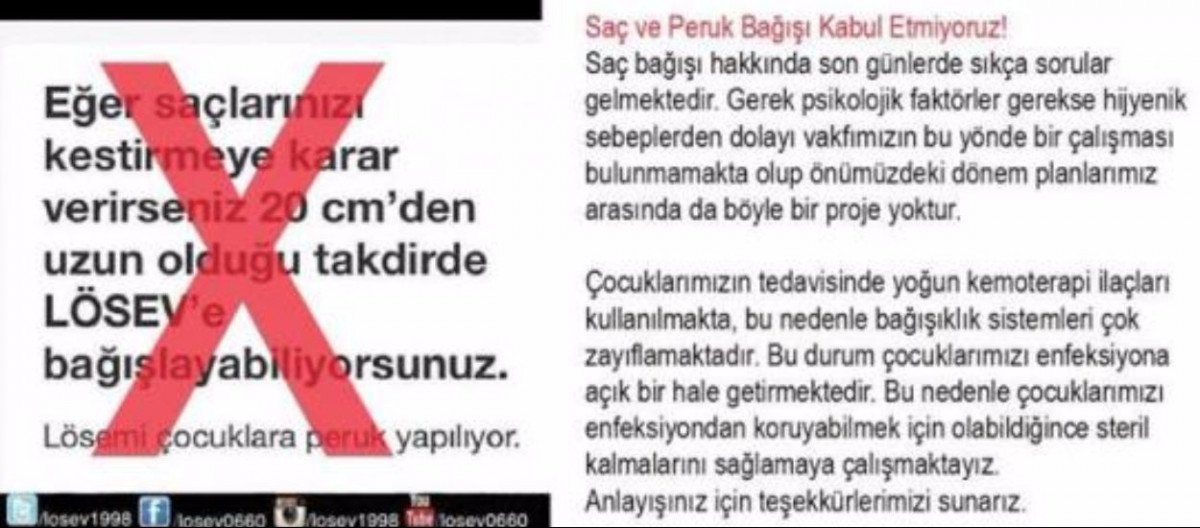 Çeşitli şekillerde uydurulan yalanlardan birisi, LÖSEV'in insanların kestirdikleri saçlarını ve eski peruklarını satın alıp, onlardan çocuklar için peruk yaptığı şekilde iğrenç bir iddiaya dayanıyor. Aslında haberi yayanlar iyi bir şey yapıyorlarmış gibi lanse ediyorlar: "Eğer saçlarınızı kestirmeye karar verirseniz 20 santimetreden uzun olduğu takdirde LÖSEV'e bağışlayabiliyorsunuz. Lösemi çocuklara peruk yapılıyor." şeklinde yayılıyor yalan haber. Bu konuyla ilgili yalanlar o kadar hızlı yayılıp çarpıtılıyor ki, LÖSEV'i rahatsız edecek boyutlara varıyor ve sonunda LÖSEV kendi sayfasından şu açıklamayı yaptı: